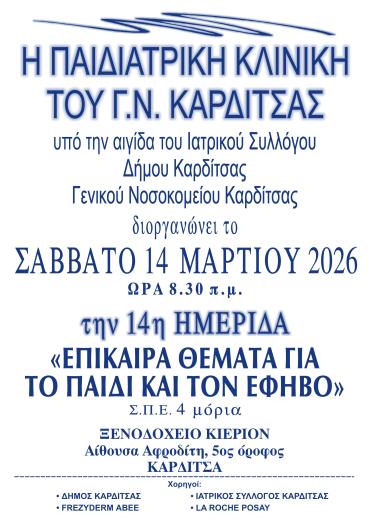 14 ΗΜΕΡΙΔΑ ΠΑΙΔΙΑΤΡΙΚΗΣ ΚΛΙΝΙΚΗΣ ΓΝ ΚΑΡΔΙΤΣΑΣ «ΕΠΙΚΑΙΡΑ ΘΕΜΑΤΑ ΓΙΑ ΤΟ ΠΑΙΔΙ ΚΑΙ ΤΟΝ ΕΦΗΒΟ», 14/03/2026