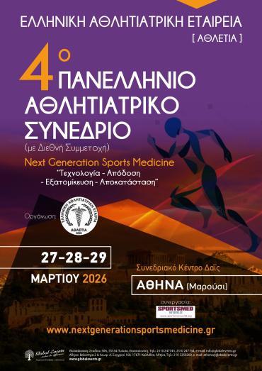 4o Πανελλήνιο Αθλητιατρικό Συνέδριο (με Διεθνή Συμμετοχή) Next Generation Sports Medicine "Τεχνολογία - Απόδοση - Εξατομίκευση - Αποκατάσταση", 27-29 Μαρτίου 2026, Συνεδριακό Κέντρο Δαΐς, Αθήνα