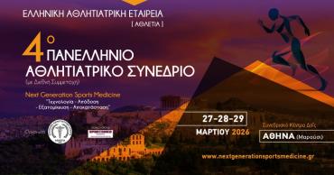 Σας γνωστοποιούμε τη διοργάνωση 4oυ Πανελλήνιου Αθλητιατρικού Συνεδρίου (με Διεθνή Συμμετοχή) Next Generation Sports Medicine "Τεχνολογία - Απόδοση - Εξατομίκευση - Αποκατάσταση”, το οποίο θα πραγματοποιηθεί στις 27 έως τις 29 Μαρτίου 2026, Συνεδριακό Κέντρο Δαΐς, στην Αθήνα.