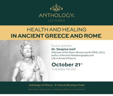 The Anthology of Athens, as part of the Anthology Lectures series, presents a lecture titled “Health and Healing in Ancient Greece and Rome,” on Tuesday, October 21, 2025, at 19:00. The speaker will be historian Dr. Despina Iosif (PhD, UCL), a specialist in the Greco-Roman world and author of Ancient Paradoxography and Life in Ancient Prisons.