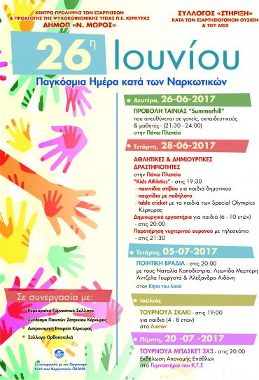 Το Κέντρο Πρόληψης των Εξαρτήσεων & Προαγωγής της Ψυχοκοινωνικής Υγείας Π.Ε. Κέρκυρας - ΔΗ.ΜΟ.Π. «Νίκος Μώρος» και ο Σύλλογος «ΣΤΗΡΙΞΗ» κατά των Εξαρτησιογόνων Ουσιών & του AIDS, θέλοντας να αναδείξουμε τις σημαντικές δυνάμεις και αποθέματα που διαθέτουμε ως πρόσωπα, ως ομάδες και ως κοινότητα, σας προσκαλούμε στις δραστηριότητες που διοργανώνουμε με αφορμή την 26η Ιουνίου, Παγκόσμια Ημέρα κατά των Ναρκωτικών.