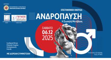 Η Ελληνική Εταιρεία Αναπαραγωγικής Ιατρικής, το Ανδρολογικό Ινστιτούτο Αθηνών και το Επιστημονικό Συμβούλιο της Κλινικής ΓΕΝΕΣΙΣ ΑΘΗΝΩΝ Α.Ε., συνδιοργανώνουν την επιστημονική ημερίδα με θέμα «Ανδρόπαυση: Η σιωπηλή μετάβαση», η οποία θα πραγματοποιηθεί την 6η Δεκεμβρίου 2025, ημέρα Σάββατο, στο Συνεδριακό Κέντρο της Ελληνικής Εταιρείας Αναπαραγωγικής Ιατρικής (Χαλάνδρι).