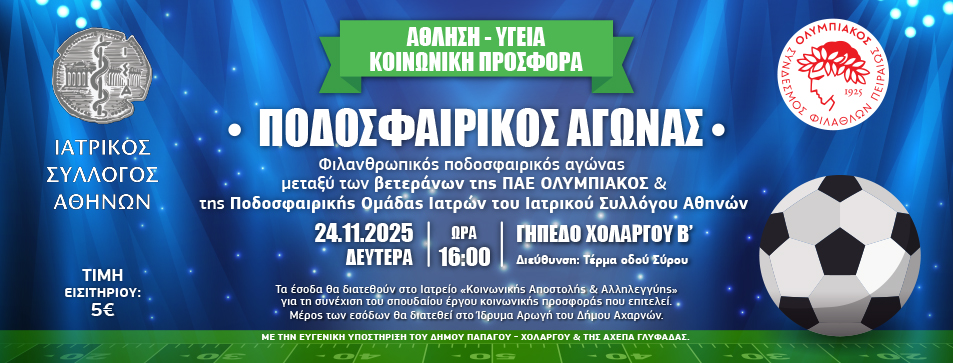 Ο Πρόεδρος Γ. Πατούλης και του Δ.Σ του Ιατρικού Συλλόγου Αθηνών προσκαλούν το κοινό να στηρίξει τον φιλανθρωπικό ποδοσφαιρικό αγώνα που θα διεξαχθεί τη Δευτέρα 24 Νοεμβρίου 2025, στις 16:00, στο Γήπεδο Χολαργού Β’ (διεύθυνση τέρμα οδού Σύρου, Χολαργός), ο οποίος είχε αναβληθεί λόγω κακοκαιρίας.