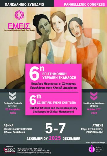 Σας προσκαλούμε στο Πανελλήνιο Συνέδριο - 6η Επιστημονική Υβριδική Εκδήλωση το οποίο διοργανώνει η Ε.Μ.Ε.Ι.Σ. (Επιστημονική Μαστολογική Εταιρεία –Ίαση-Στήριξη) και θα πραγματοποιηθεί από 5 έως 7 Δεκεμβρίου 2025 στην Αθήνα, στο Ξενοδοχείο Royal Olympic - αίθουσα Panorama.