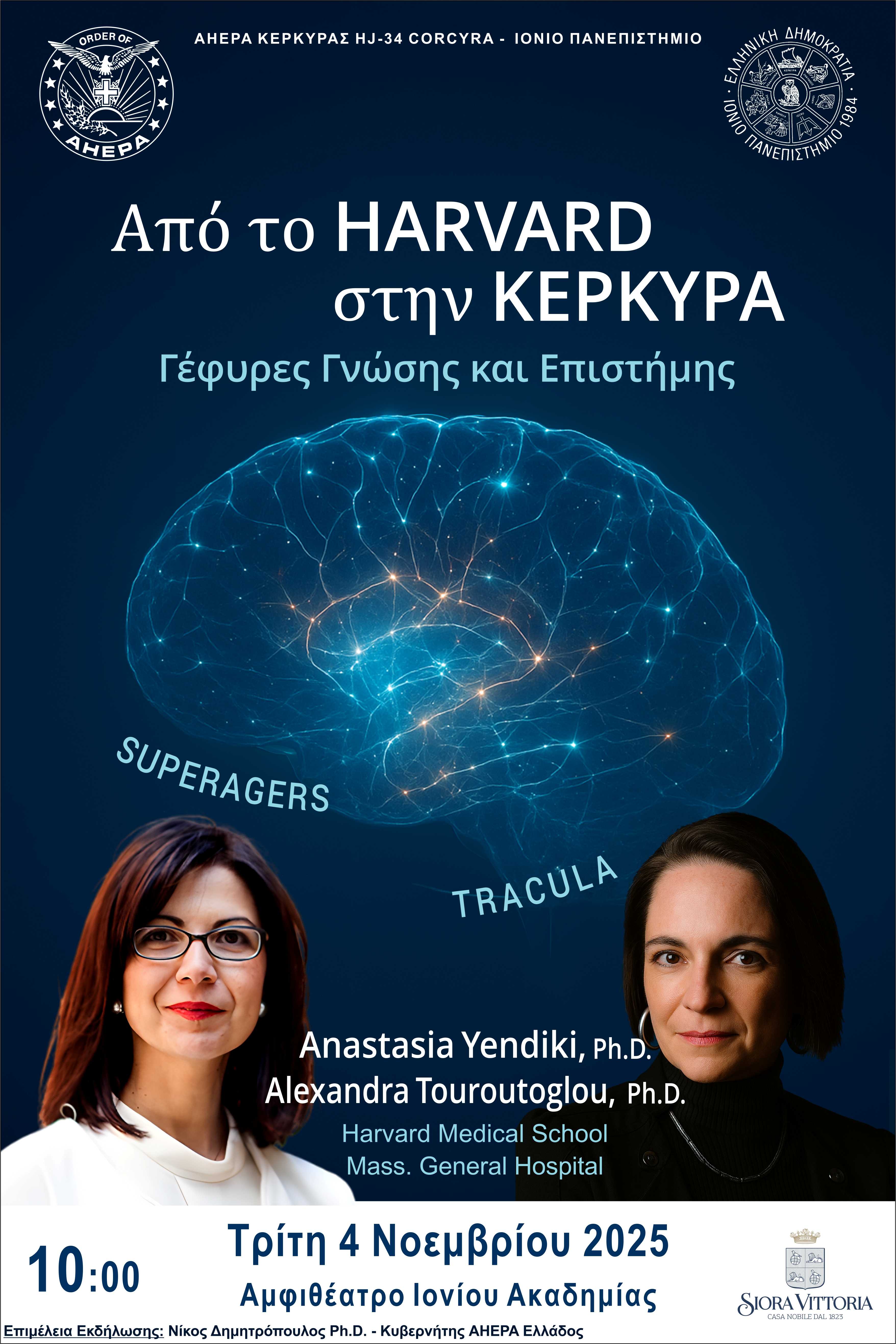 Παρουσίαση έρευνας γύρω από τη νευροεπιστήμη: «Από το Harvard στην Κέρκυρα! - Γέφυρες Γνώσης και Επιστήμης» Τρίτη 4 Νοεμβρίου - Ιόνιος Ακαδημία