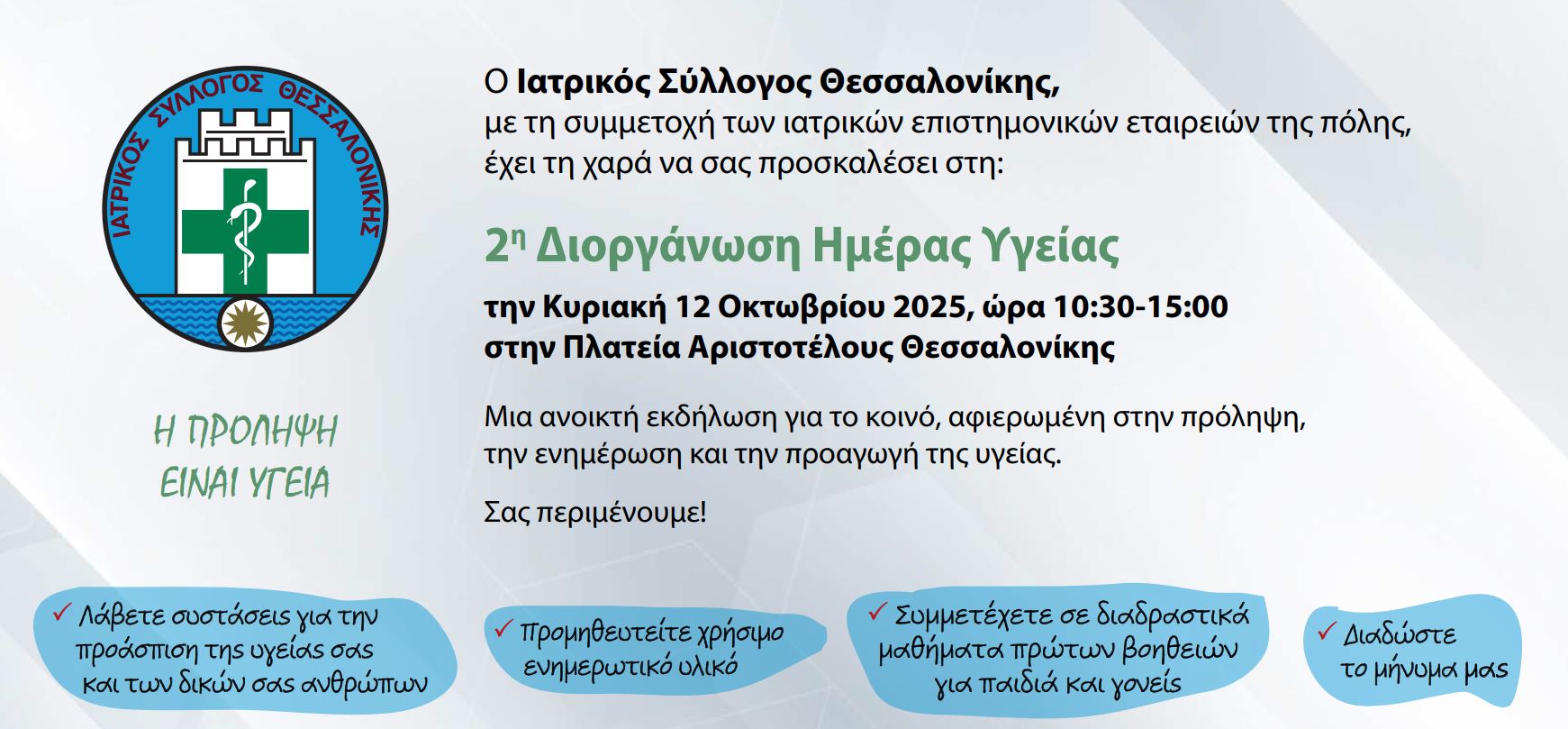Ο Ιατρικός Σύλλογος Θεσσαλονίκης (ΙΣΘ) έχει την τιμή να σας προσκαλέσει στην ανοιχτή εκδήλωση με θέμα “Πρόληψη και Υγεία”, η οποία διοργανώνεται για δεύτερη συνεχή χρονιά, μετά την εξαιρετική ανταπόκριση που γνώρισε η περσινή διοργάνωση με αφορμή τα 100 χρόνια λειτουργίας του Συλλόγου, την Κυριακή 12 Οκτωβρίου 2025, από τις 10:30 έως τις 15:00, στην Πλατεία Αριστοτέλους, στη Θεσσαλονίκη.
