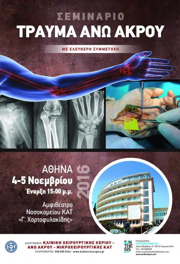 Η Κλινική Χειρουργικής Χεριού - Άνω Άκρου - Μικροχειρουργικής ΚΑΤ διοργανώνει σεμινάριο με θέμα "Τραύμα Άνω Άκρου" στο αμφιθέατρο του Νοσοκομείου ΚΑΤ "Γ. Χαρτοφυλακίδης", το διήμερο 4 & 5 Νοεμβρίου.