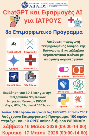 Το Πανεπιστήμιο Αιγαίου διοργανώνει το 8ο Επιμορφωτικό Πρόγραμμα «ChatGPT και Εφαρμογές ΑΙ για Ιατρούς», το οποίο θα διενεργηθεί τόσο ασύγχρονα (100 ώρες) όσο και με online μέθοδο διδασκαλίας (10 ώρες) μέσω Webinar το Σαββατοκύριακο 16 και 17 Μαΐου 2026.