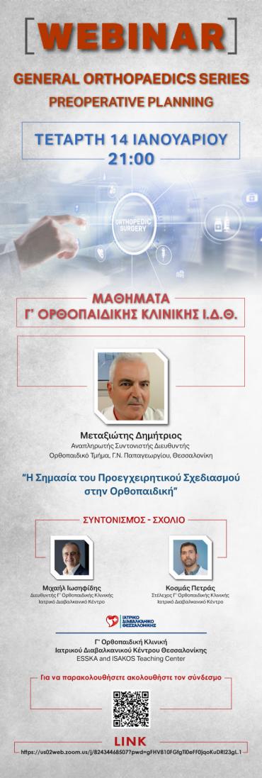 WEBINAR: "General Orthopaedics Series: Preoperative Planning" 14-01-2026| 21:00 14/01/2026 Την Τετάρτη 14 Ιανουαρίου 2026, ώρα 21.00 συνδεθείτε απευθείας στο ΖΟΟΜ meeting ΧΩΡΙΣ ΠΡΟΕΓΓΡΑΦΗ, απλά πατώντας στον παρακάτω σύνδεσμο ΣΥΝΔΕΘΕΙΤΕ ΕΔΩ
