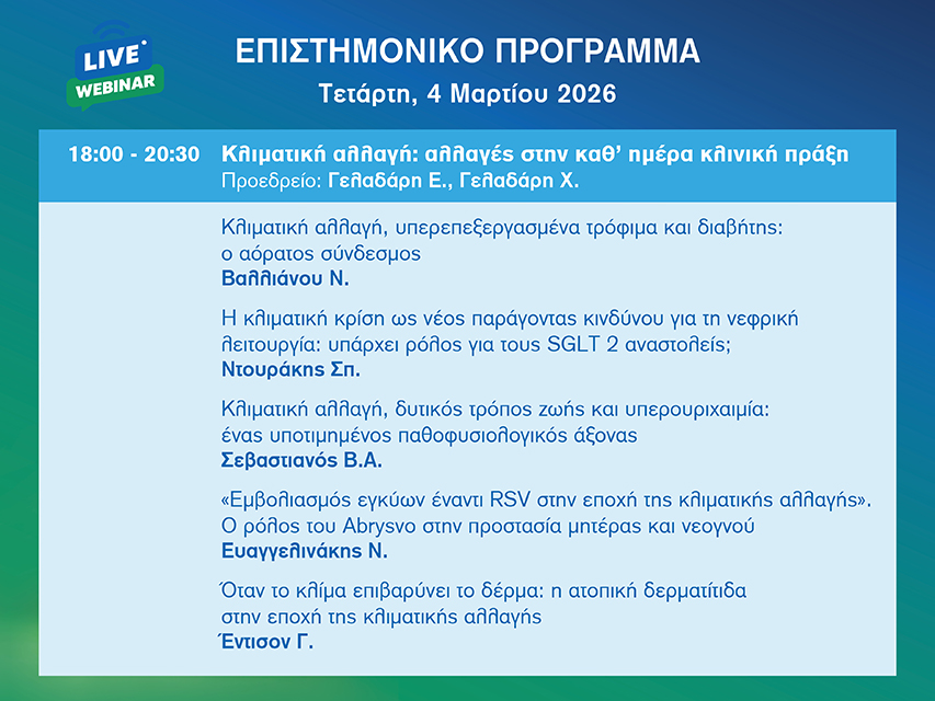 Webinar: Κλιματική αλλαγή: αλλαγές στην καθ΄ ημέρα κλινική πράξη - ΔΩΡΕΑΝ ΕΓΓΡΑΦΗ! 26/02/2026 Για την Εγγραφή σας, πατήστε ΕΔΩ Το Πρόγραμμα είναι διαθέσιμο στα συνημμένα αρχεία. EE_WEBINARS_2026_KARTA_2.jpg EE_WEBINARS_2026_KARTA_3.jpg