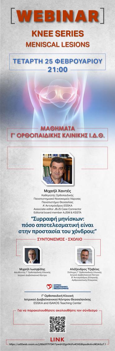 WEBINAR: Knee Series "Συρραφή μηνίσκων: Πόσο αποτελεσματική είναι στην προστασία του χόνδρου;" 25-02-2026| 21:00