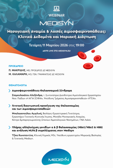 Ο Πανελλήνιος Συνεταιρισμός Εργαστηριακών Ιατρών Medisyn διοργανώνει επιστημονικό webinar με θέμα «Μεσογειακή Αναιμία & Λοιπές Αιμοσφαιρινοπάθειες: Κλινικά Δεδομένα και Μοριακή Διάγνωση», την Τετάρτη 11 Μαρτίου 2026 στις 19:00, με τη συμμετοχή διακεκριμένων επιστημόνων στον τομέα της Αιματολογίας και της Γενετικής.